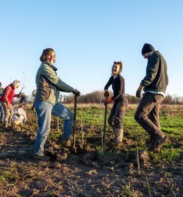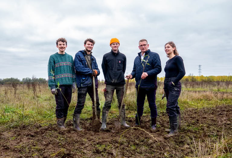 Dit zijn Katja Zweerus, Simon Verboom, Sacha Brons en Wytze Walstra: ook bekend als De Jonge Voedselbosboeren. Vier jonge ondernemers die ongezonde, uitgeputte landbouwgrond weer tot leven brengen. Natuur en voedselproductie hoeven geen gescheiden werelden te zijn. Hun missie is om juist die twee bij elkaar te brengen. In Elst leggen de boeren de komende jaren 6,5ha bos aan. In de winter '24/'25 werden met de hulp van veel vrijwilligers al 17.000 bomen geplant. Komende jaren volgen nog veel meer bomen.